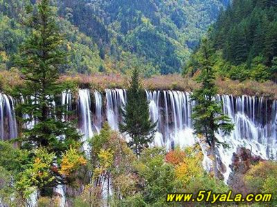 九寨沟总面积约620平方公里。其中52%为林木繁茂的原始森林。 自然景色兼有湖泊、瀑布、雪山、森林之美,有“童话世界”的美誉。大多数景点集中于“Y"字形的三条主沟内,纵横50公里。根据专家的考察,这种高山湖泊是在地球新构造运动中,地壳发生急剧变化,山体不平衡隆起和河流侵蚀作用形成的。分冰川剥蚀、岩溶洼地阻塞湖、泥石流堰塞湖、滑坡与崩塌堰塞湖四大类。他们的共同特点是:水色清澈透明,幽静深邃,彼此以台瀑相连,逶迤不绝,小的有半亩,大的有千亩以上。四岸有千年古木,奇花异草,四时变化,色彩纷呈,倒影斑斓,气象万千。其中最大的长海,长7公里,海拔3000米,澄如碧潭,冬可滑冰,夏可行船。临近的五花海,由于湖底有各种色素的矿物质和枯枝败叶、海藻等沉积物,经过阳光的折射,幻出丰富多姿的色彩,成为名副其实的彩色湖。 九寨沟现已规划为:树正景区(火花海、卧龙海、犀牛海、古磨房和树正瀑布);日则景区(珍珠滩、诺日朗瀑布、珍珠滩瀑布、高瀑布);剑岩景区(天鹅海、悬泉、剑岩原始森林、熊猫海);长海景区(长海、五花海、上季节海、下季节海);扎如景区(骑马、野餐、藏族村寨民俗)等几个景区。已开发出二滩、三沟、四瀑、十八群海。最著名的景点有剑悬泉、芳草海、天鹅湖、剑竹海、熊猫海、高瀑布、五花海、珍珠滩瀑布、镜海、诺日朗瀑布、犀牛海、树正瀑布、树正群海、卧龙海、火花海、芦苇海、留景滩、长海、五彩池、上、下季节海等。各景点之间栈道幽深,小桥横跨,村寨古朴,民风各异,令人有飘然出世的超凡脱俗之感。妩媚的春日,九寨沟众多景点 万紫千红;炎炎夏日,则浓荫滴翠;醉人之金秋,则五彩斑斓;严寒隆冬,其景色则冰清玉洁。真可谓四季分明,各有千秋,其中尤以金秋最为迷人。 深藏在林中的108个高原湖泊---海子,每到其时,天高气爽,碧水澄澈。映衬着漫山遍野绚丽多彩的秋林,水底五彩石,天上飘白云,如梦似幻,如醉如痴。火花海、五彩池等景点因池水清澈,湖底石质晶莹而折射阳光,呈现出梦幻似的光彩,步移景换,犹如进入了童话世界,珍珠滩水波粼粼,如飞珠碎玉。诺日朗瀑布宽达100余米,从30米高的石崖上,飞泻而下,色彩明艳,另具一番秀雅自然,清纯优美的风韵。 九寨沟的森林2万余公顷,在2000米至4000米的高山上垂直密布。主要品种有红松、云杉、冷杉、赤桦、领春木、连香树等。在这里的原始森林中,栖息着珍贵的大熊猫、白唇鹿、苏门羚、扭角羚、毛冠鹿、金猫等动物。海子中野鸭成群,天鹅、鸳鸯也常来嬉戏,是我国著名的自然保护区之一。
